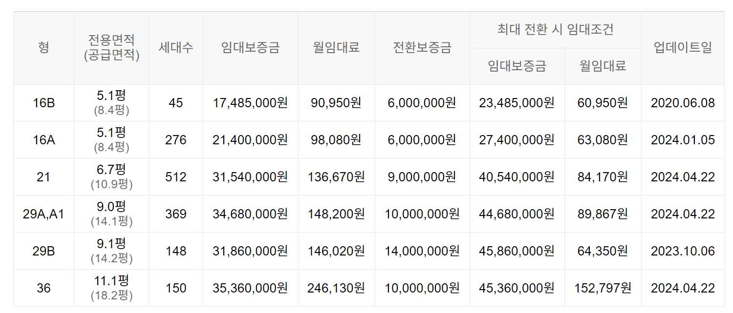 임대보증금 및 월 임대료는 입주자 모집공고일 기준이며, 보증금 최대 전환 시 변동될 수 있습니다.