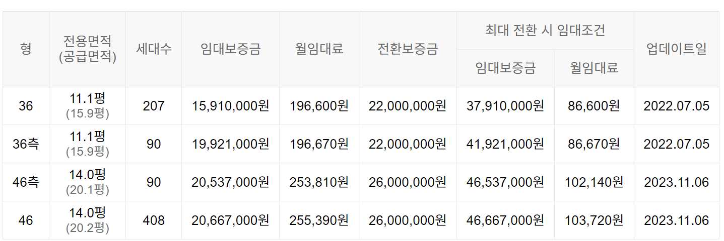 임대보증금 및 월 임대료는 입주자 모집공고일 기준이며, 보증금 최대 전환 시 변동될 수 있습니다.