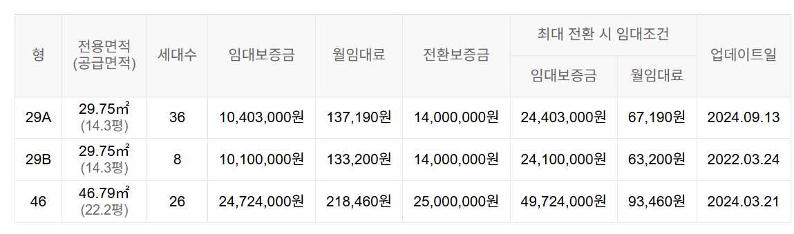 임대보증금 및 월 임대료는 입주자 모집공고일 기준이며, 보증금 최대 전환 시 변동될 수 있습니다.