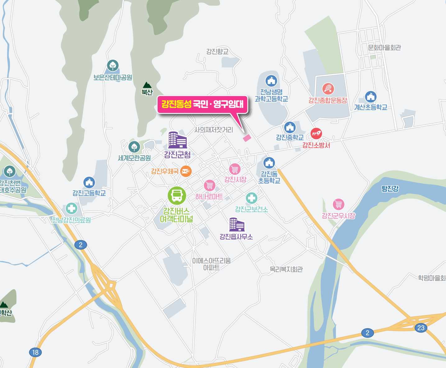 강진버스터미널 도보 10~15분 이내, 국도 2호선 및 23호선 인접