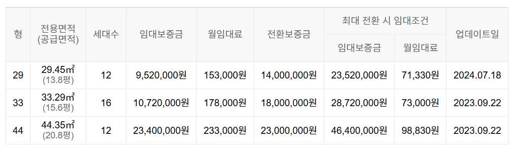 임대보증금 및 월 임대료는 입주자 모집공고일 기준이며, 보증금 최대 전환 시 변동될 수 있습니다.