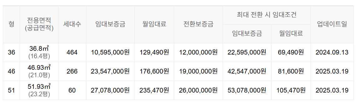 임대보증금 및 월 임대료는 입주자 모집공고일 기준이며, 보증금 최대 전환 시 변동될 수 있습니다.