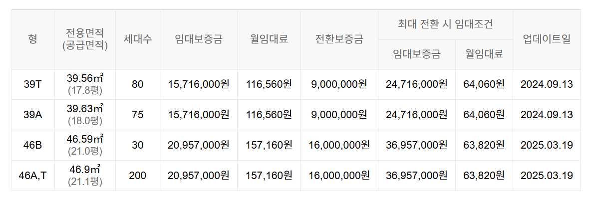 임대보증금 및 월 임대료는 입주자 모집공고일 기준이며, 보증금 최대 전환 시 변동될 수 있습니다.