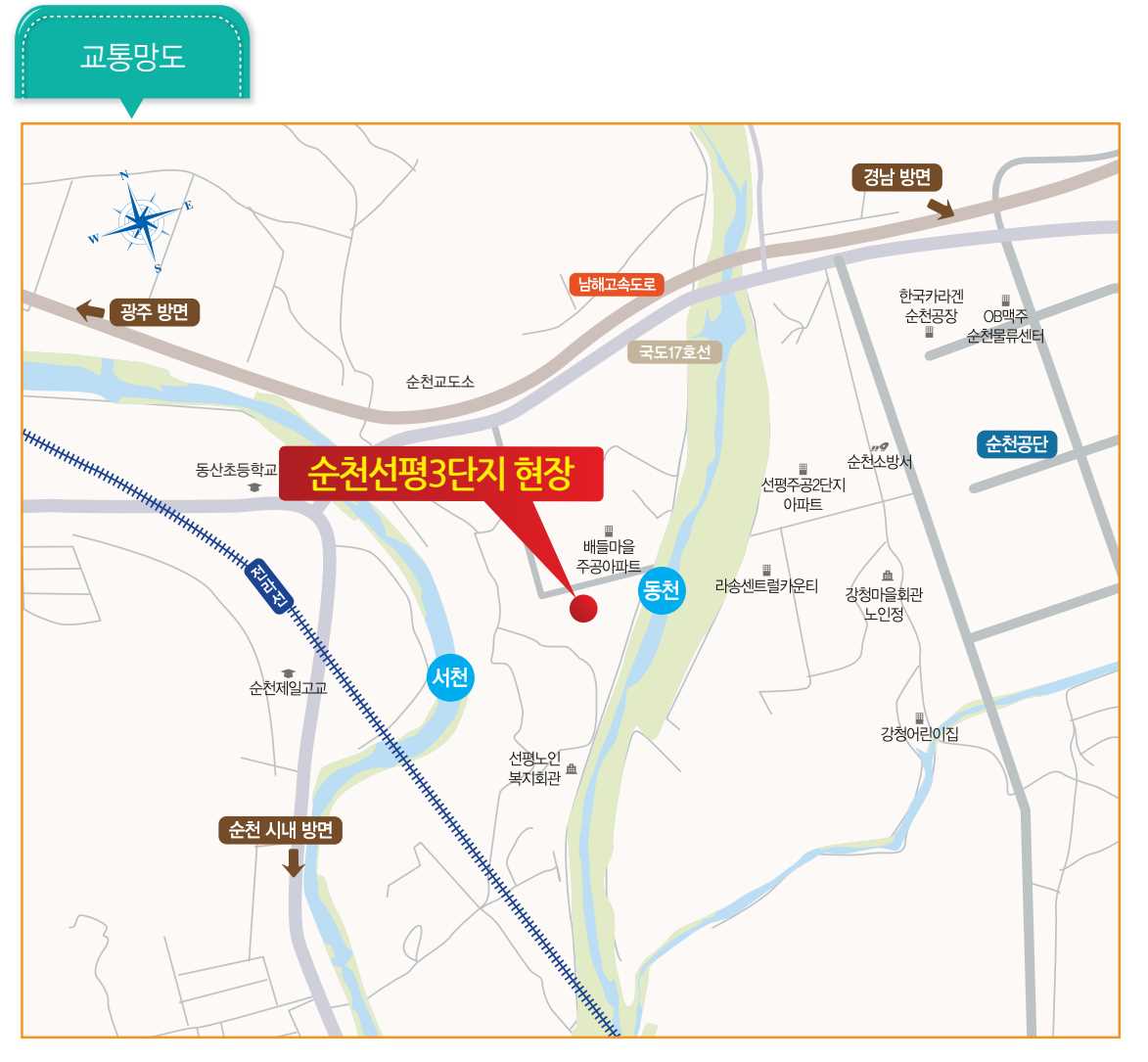 서면 시내·농어촌 버스 정류장 도보 이용 가능, 국도 2호선 접근 용이, 순천터미널·순천역 차량 15분 이내