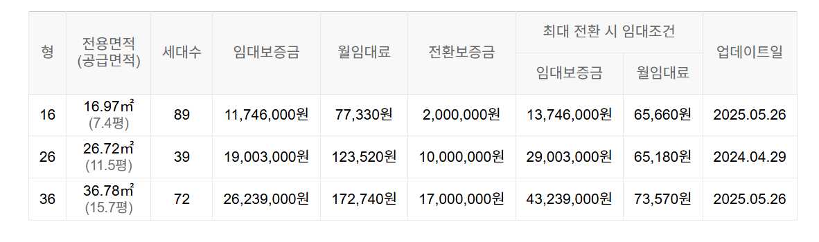 임대보증금 및 월 임대료는 입주자 모집공고일 기준이며, 보증금 최대 전환 시 변동될 수 있습니다.