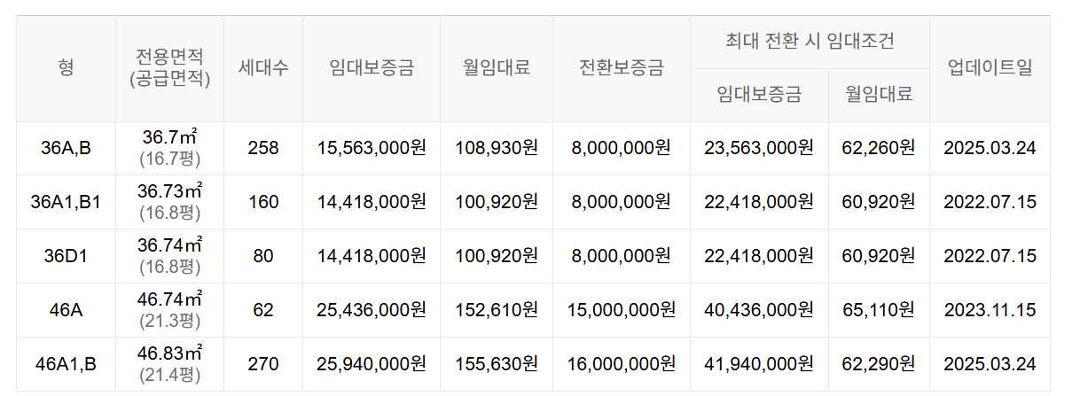 임대보증금 및 월 임대료는 입주자 모집공고일 기준이며, 보증금 최대 전환 시 변동될 수 있습니다.