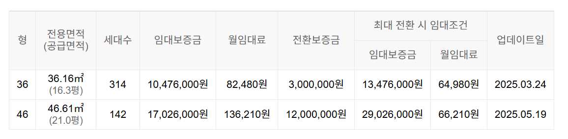 임대보증금 및 월 임대료는 입주자 모집공고일 기준이며, 보증금 최대 전환 시 변동될 수 있습니다.