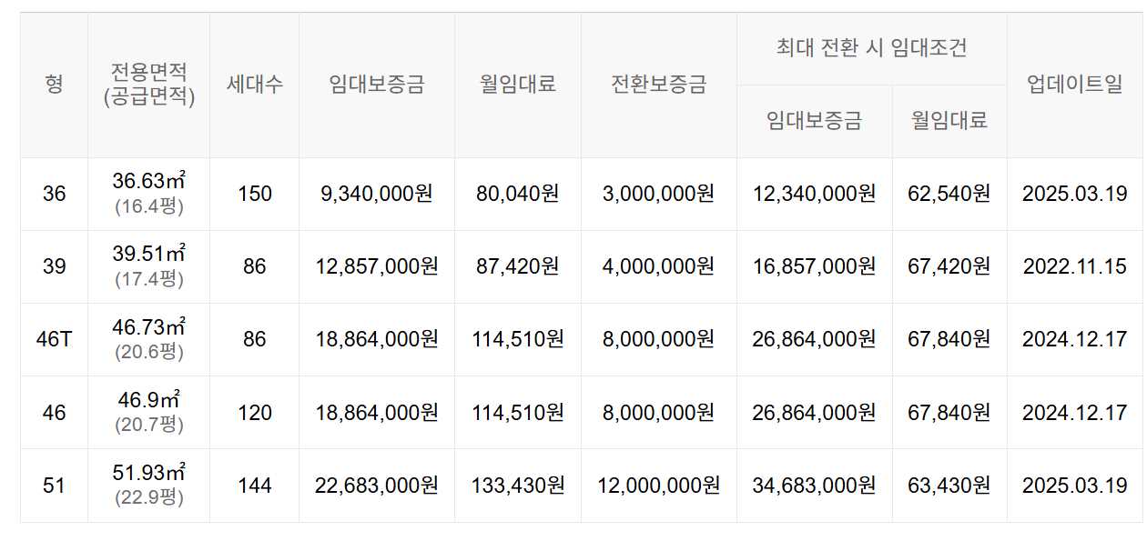 임대보증금 및 월 임대료는 입주자 모집공고일 기준이며, 보증금 최대 전환 시 변동될 수 있습니다.