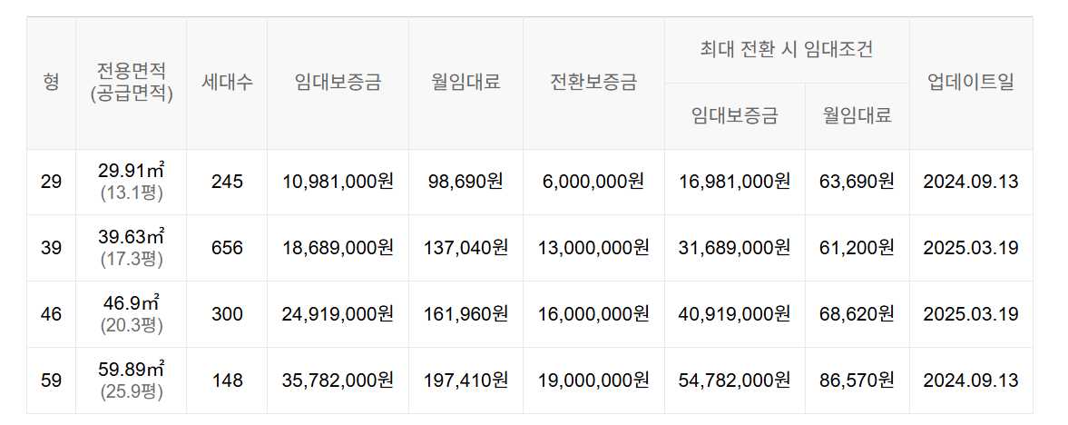 임대보증금 및 월 임대료는 입주자 모집공고일 기준이며, 보증금 최대 전환 시 변동될 수 있습니다.