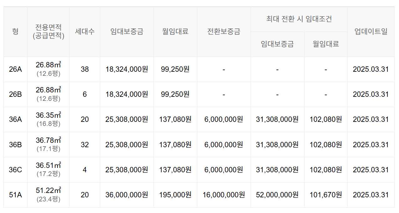 임대보증금 및 월 임대료는 입주자 모집공고일 기준이며, 보증금 최대 전환 시 변동될 수 있습니다.