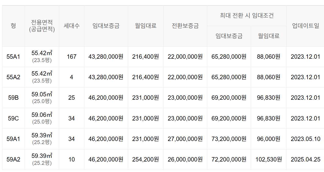 임대보증금 및 월 임대료는 입주자 모집공고일 기준이며, 보증금 최대 전환 시 변동될 수 있습니다.