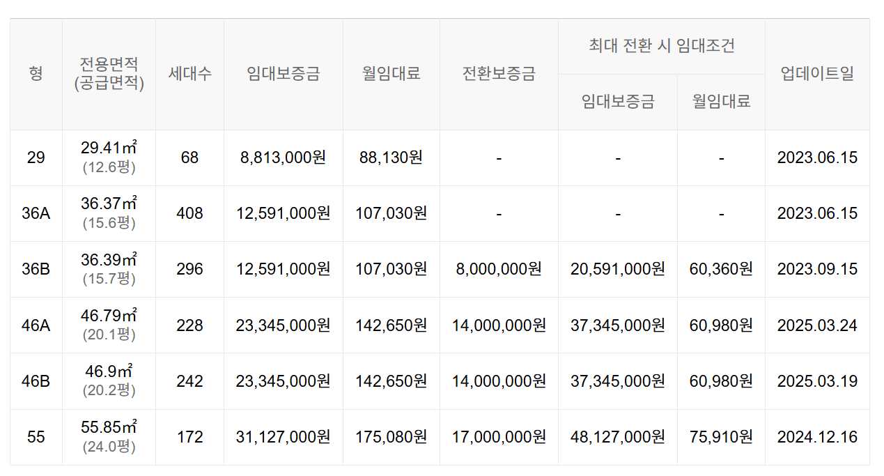 임대보증금 및 월 임대료는 입주자 모집공고일 기준이며, 보증금 최대 전환 시 변동될 수 있습니다.