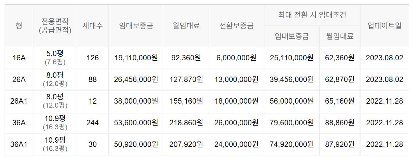 임대보증금 및 월 임대료는 입주자 모집공고일 기준이며, 보증금 최대 전환 시 변동될 수 있습니다.
