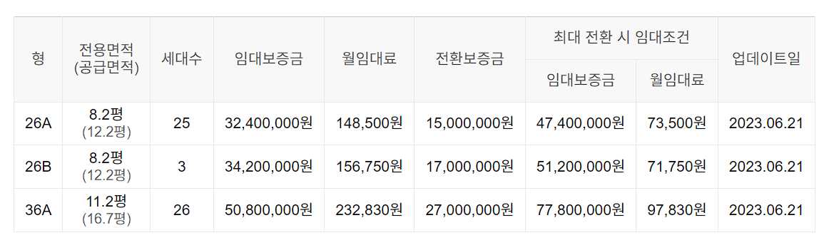 임대보증금 및 월 임대료는 입주자 모집공고일 기준이며, 보증금 최대 전환 시 변동될 수 있습니다.