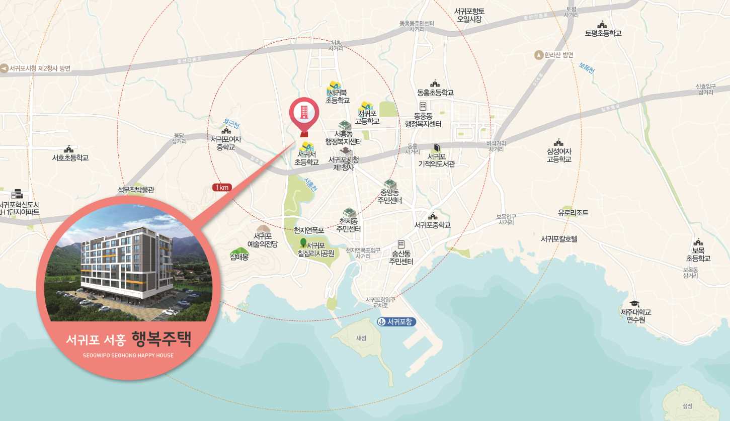 서귀포서홍 행복주택은 서귀포시 시내 서귀서초등학교 근처에 위치하고 있습니다.