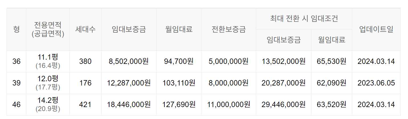 임대보증금 및 월 임대료는 입주자 모집공고일 기준이며, 보증금 최대 전환 시 변동될 수 있습니다.