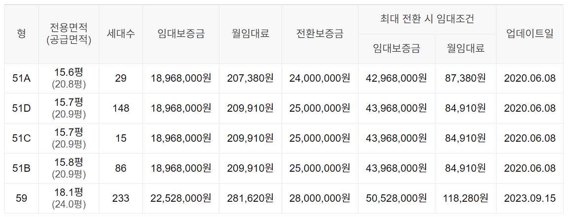 임대보증금 및 월 임대료는 입주자 모집공고일 기준이며, 보증금 최대 전환 시 변동될 수 있습니다.