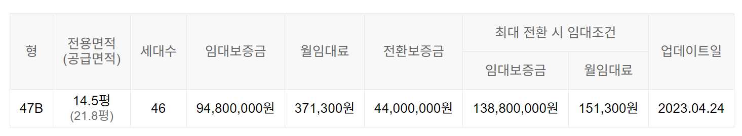 임대보증금 및 월 임대료는 입주자 모집공고일 기준이며, 보증금 최대 전환 시 변동될 수 있습니다.