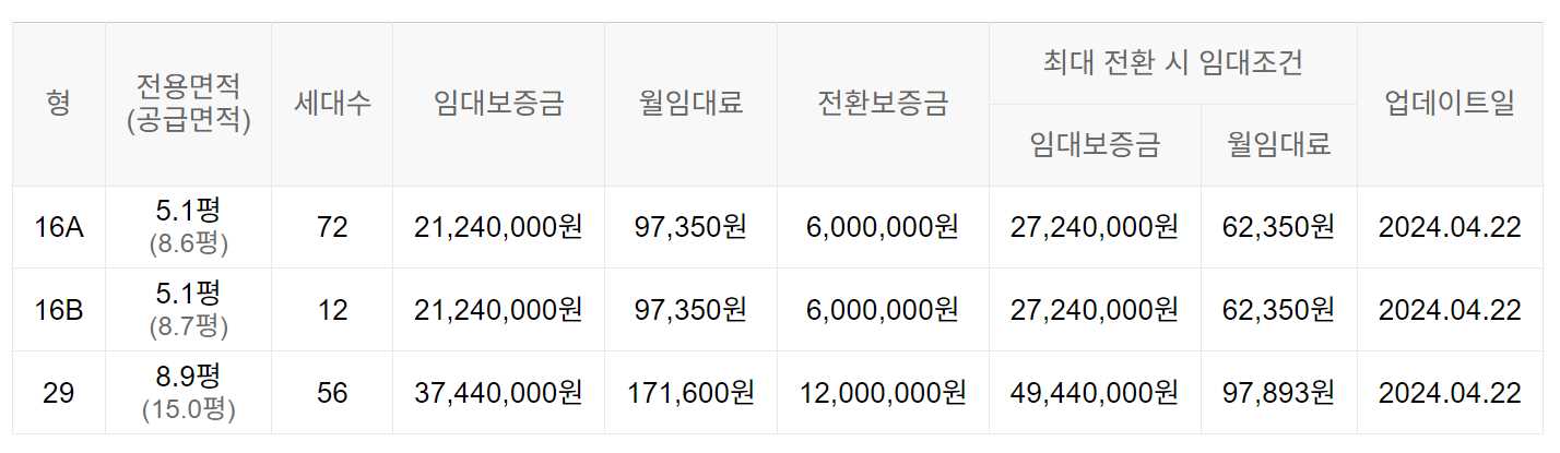 임대보증금 및 월 임대료는 입주자 모집공고일 기준이며, 보증금 최대 전환 시 변동될 수 있습니다.