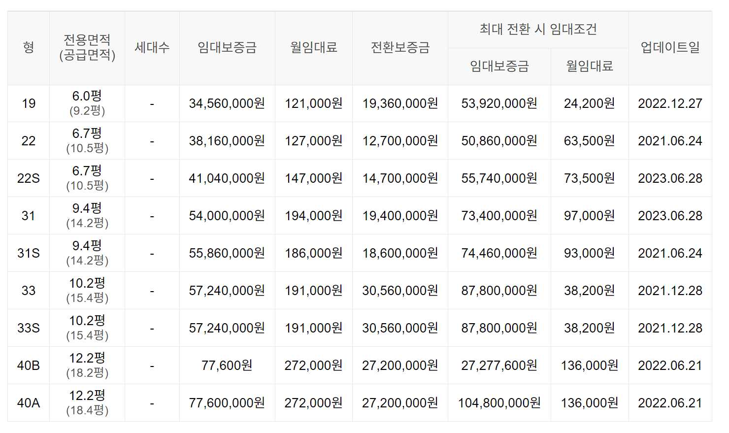 임대보증금 및 월 임대료는 입주자 모집공고일 기준이며, 보증금 최대 전환 시 변동될 수 있습니다.