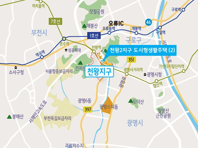 천왕연지마을2단지는 서울 구로구 천왕역, 개웅산근처에 위치하고 있습니다.