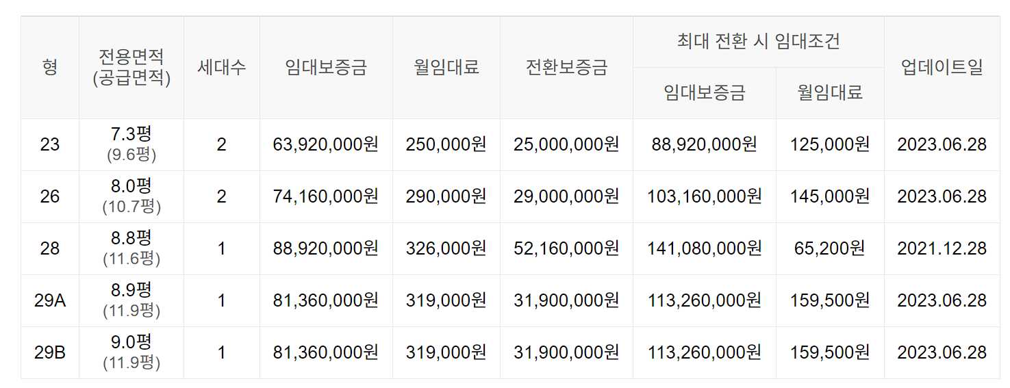임대보증금 및 월 임대료는 입주자 모집공고일 기준이며, 보증금 최대 전환 시 변동될 수 있습니다.