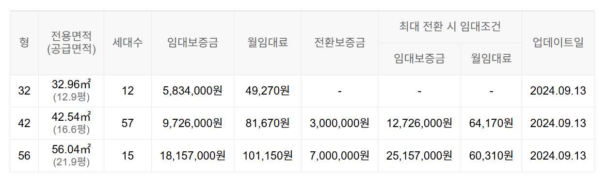 임대보증금 및 월 임대료는 입주자 모집공고일 기준이며, 보증금 최대 전환 시 변동될 수 있습니다.