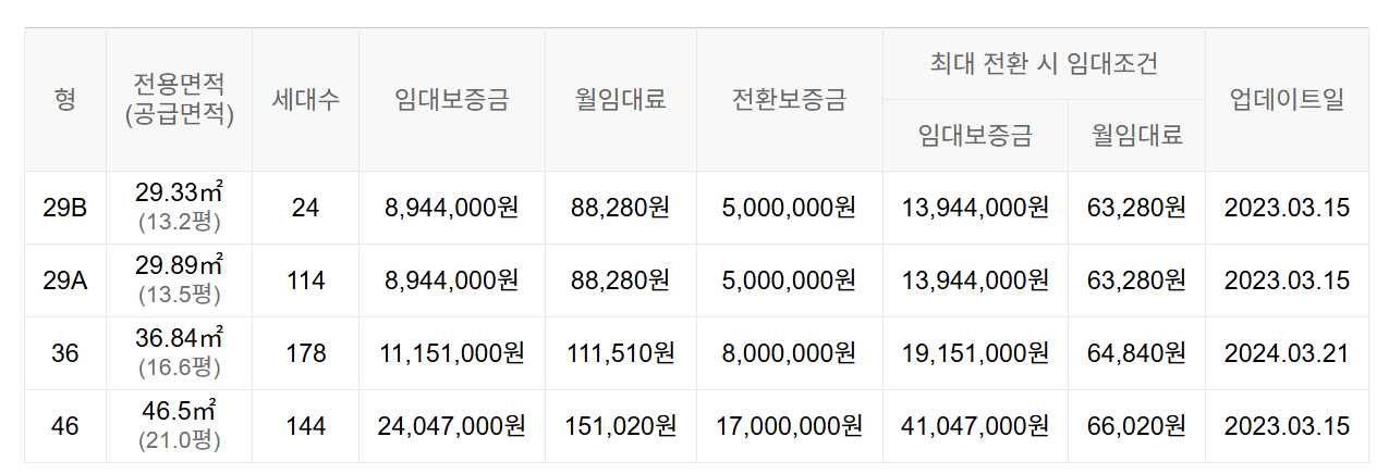 임대보증금 및 월 임대료는 입주자 모집공고일 기준이며, 보증금 최대 전환 시 변동될 수 있습니다.