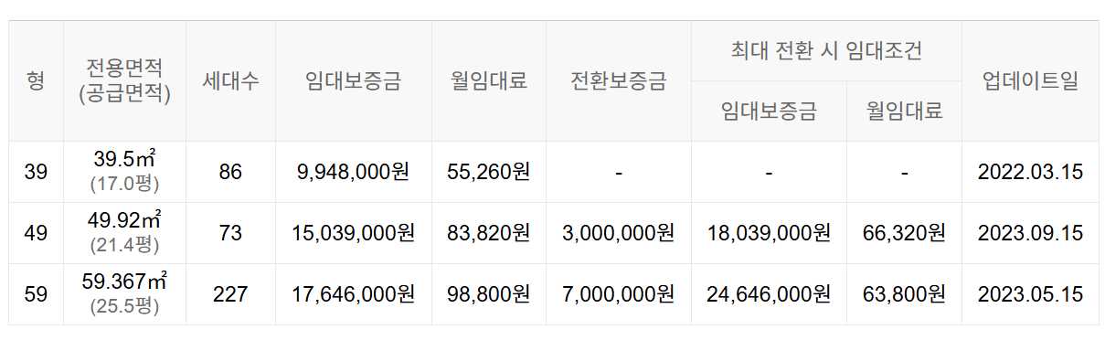 임대보증금 및 월 임대료는 입주자 모집공고일 기준이며, 보증금 최대 전환 시 변동될 수 있습니다.