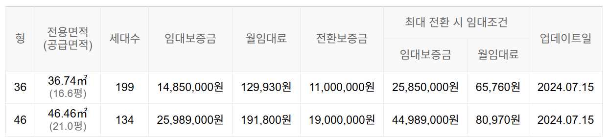 임대보증금 및 월 임대료는 입주자 모집공고일 기준이며, 보증금 최대 전환 시 변동될 수 있습니다.