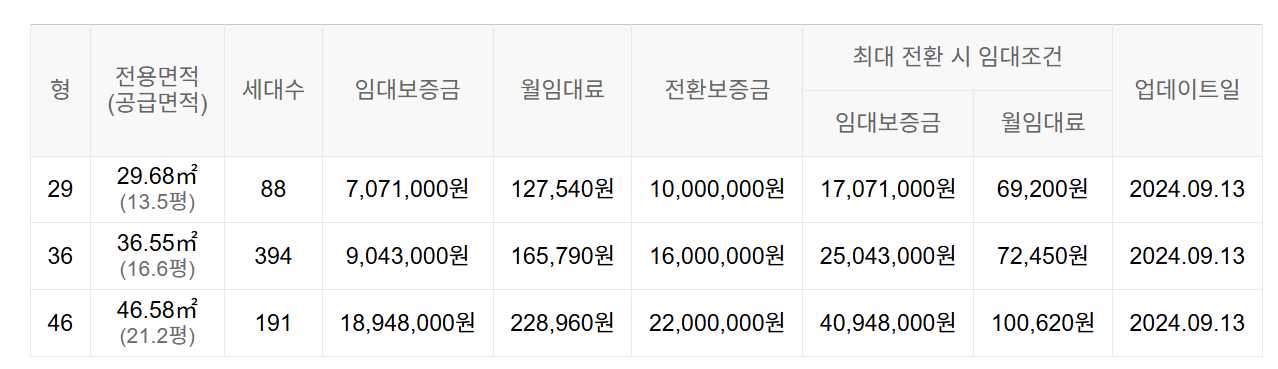 임대보증금 및 월 임대료는 입주자 모집공고일 기준이며, 보증금 최대 전환 시 변동될 수 있습니다.