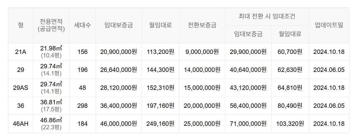 임대보증금 및 월 임대료는 입주자 모집공고일 기준이며, 보증금 최대 전환 시 변동될 수 있습니다.