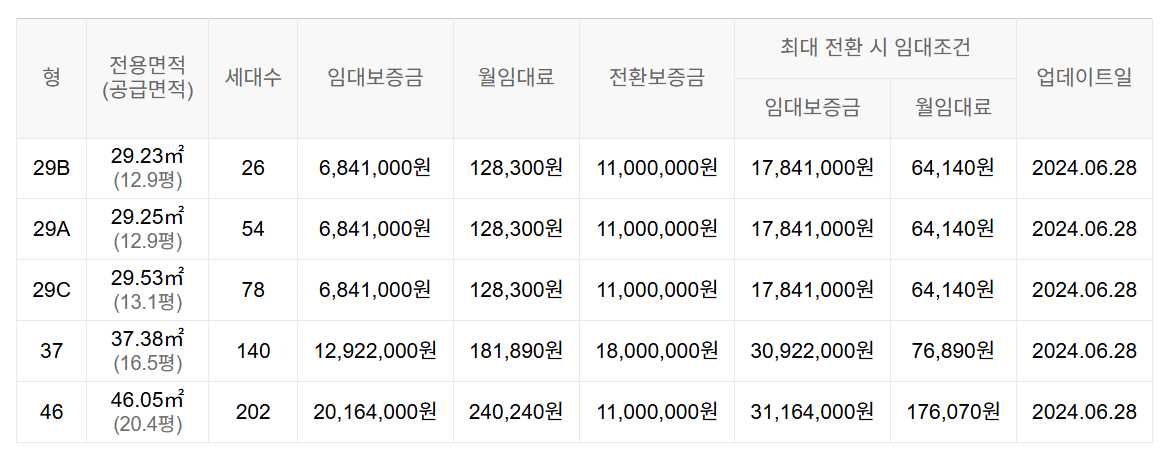 임대보증금 및 월 임대료는 입주자 모집공고일 기준이며, 보증금 최대 전환 시 변동될 수 있습니다.