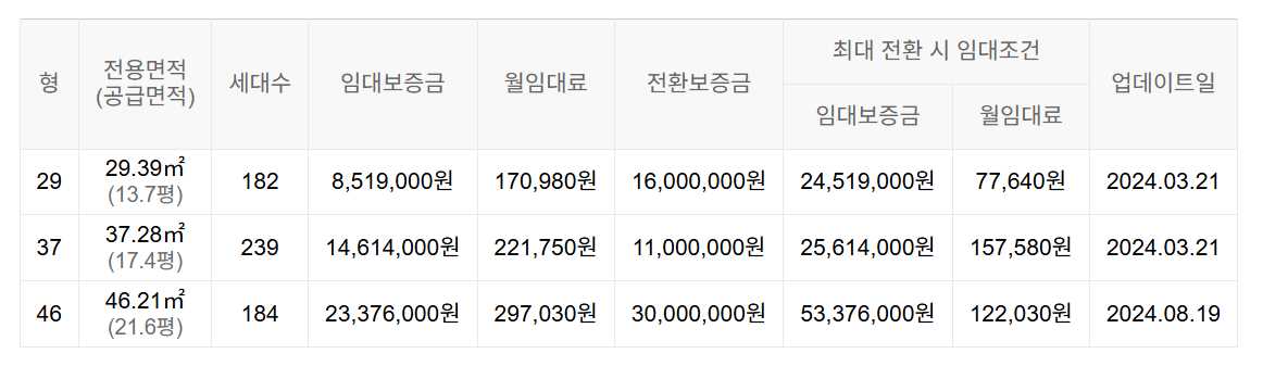 임대보증금 및 월 임대료는 입주자 모집공고일 기준이며, 보증금 최대 전환 시 변동될 수 있습니다.