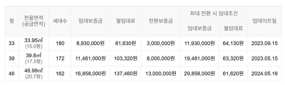 임대보증금 및 월 임대료는 입주자 모집공고일 기준이며, 보증금 최대 전환 시 변동될 수 있습니다.