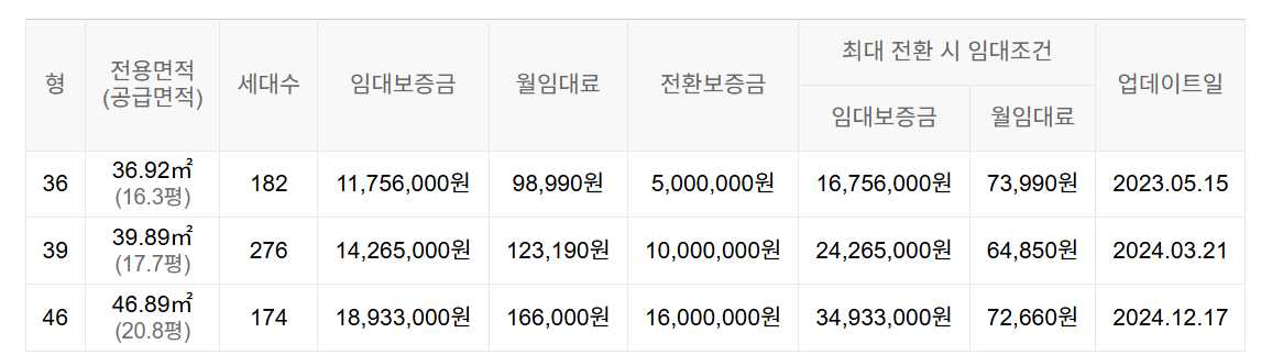 임대보증금 및 월 임대료는 입주자 모집공고일 기준이며, 보증금 최대 전환 시 변동될 수 있습니다.