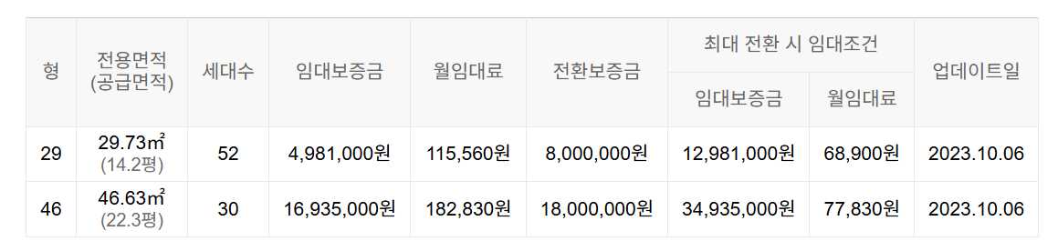 임대보증금 및 월 임대료는 입주자 모집공고일 기준이며, 보증금 최대 전환 시 변동될 수 있습니다.