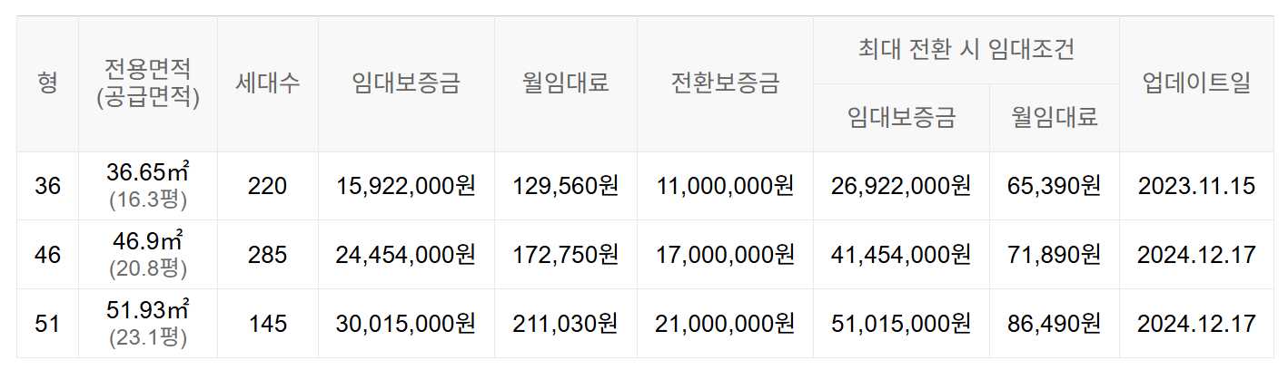 임대보증금 및 월 임대료는 입주자 모집공고일 기준이며, 보증금 최대 전환 시 변동될 수 있습니다.