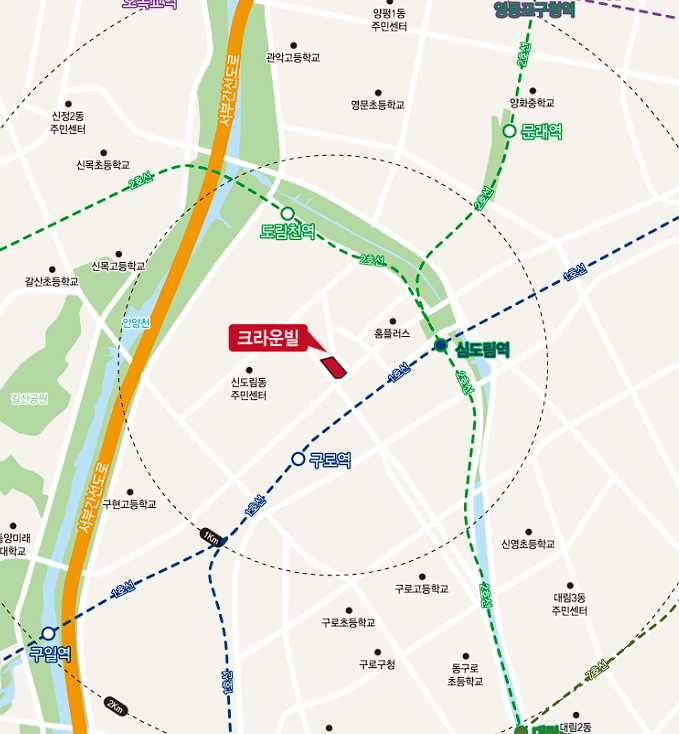 크라운빌2차는 서울 구로구 구로역, 신도림역, 현대백화점, 이마트, 홈플러스 근처에 위치하고 있습니다.