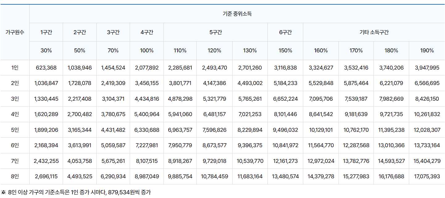 - 1인 가구는 해당 가구원수별 기준 중위소득에 20%p, 2인 가구는 10%p를 더한 금액으로 적용