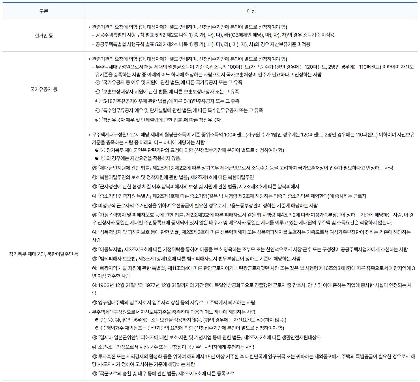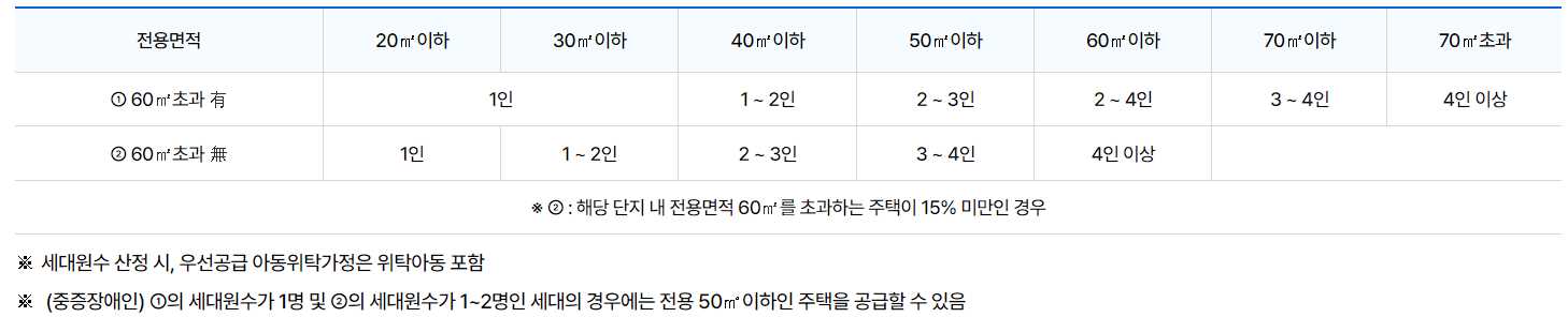 - 우선공급 : 월평균소득이 기준 중위소득 100% 이하