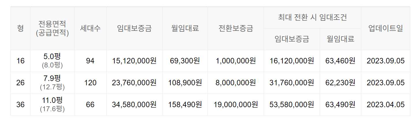 임대보증금 및 월 임대료는 입주자 모집공고일 기준이며, 보증금 최대 전환 시 변동될 수 있습니다.