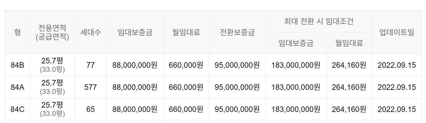임대보증금 및 월 임대료는 입주자 모집공고일 기준이며, 보증금 최대 전환 시 변동될 수 있습니다.
