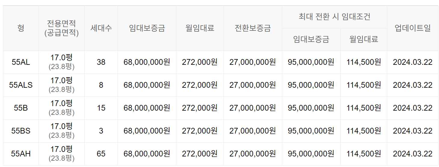 임대보증금 및 월 임대료는 입주자 모집공고일 기준이며, 보증금 최대 전환 시 변동될 수 있습니다.