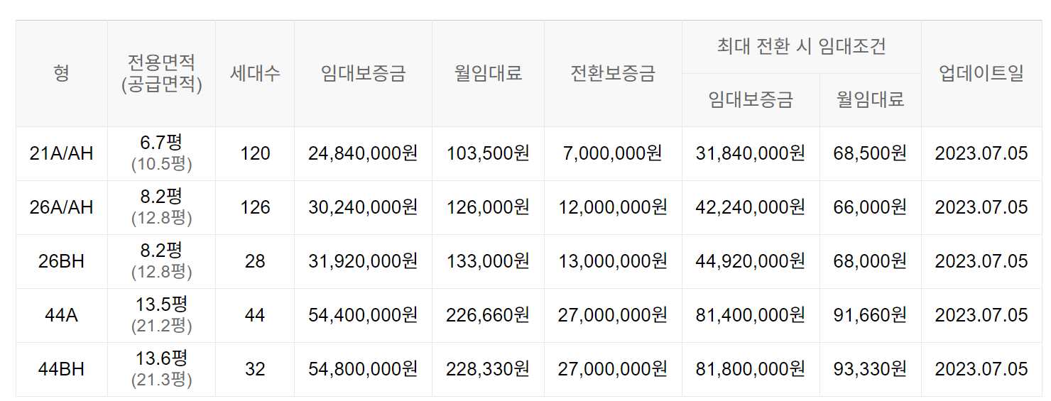 임대보증금 및 월 임대료는 입주자 모집공고일 기준이며, 보증금 최대 전환 시 변동될 수 있습니다.
