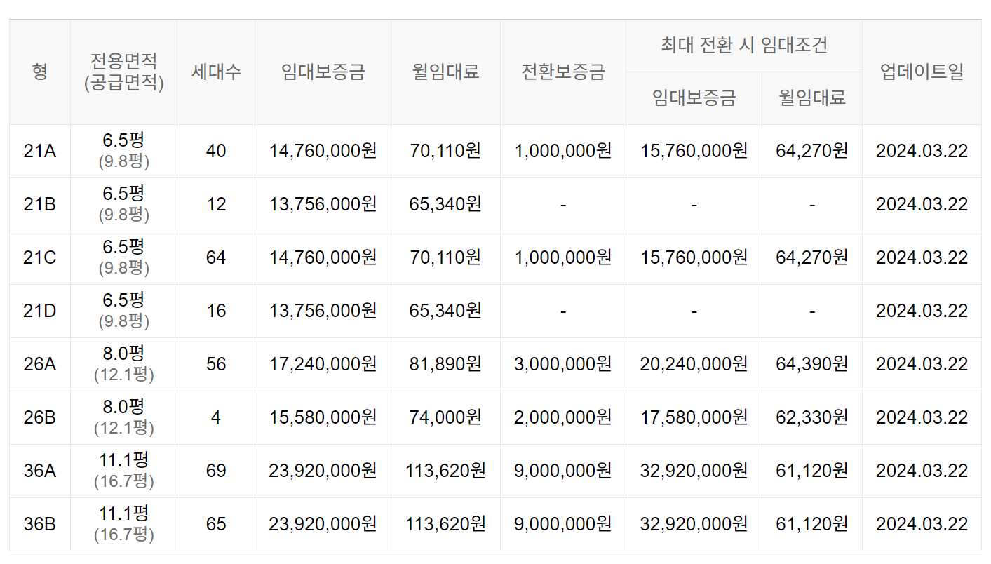 임대보증금 및 월 임대료는 입주자 모집공고일 기준이며, 보증금 최대 전환 시 변동될 수 있습니다.