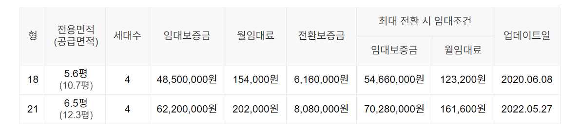 임대보증금 및 월 임대료는 입주자 모집공고일 기준이며, 보증금 최대 전환 시 변동될 수 있습니다.