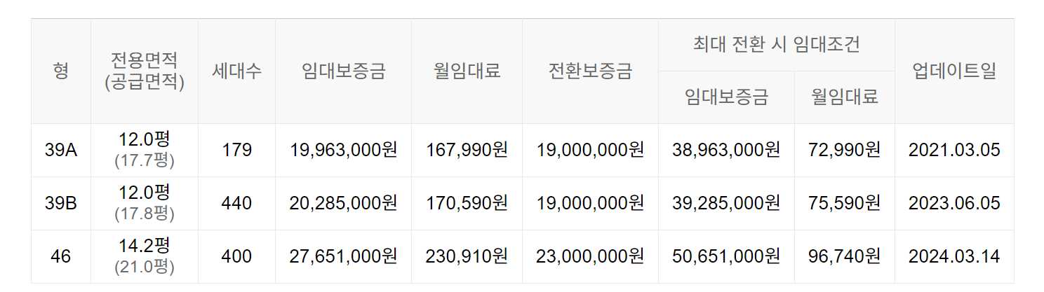 임대보증금 및 월 임대료는 입주자 모집공고일 기준이며, 보증금 최대 전환 시 변동될 수 있습니다.