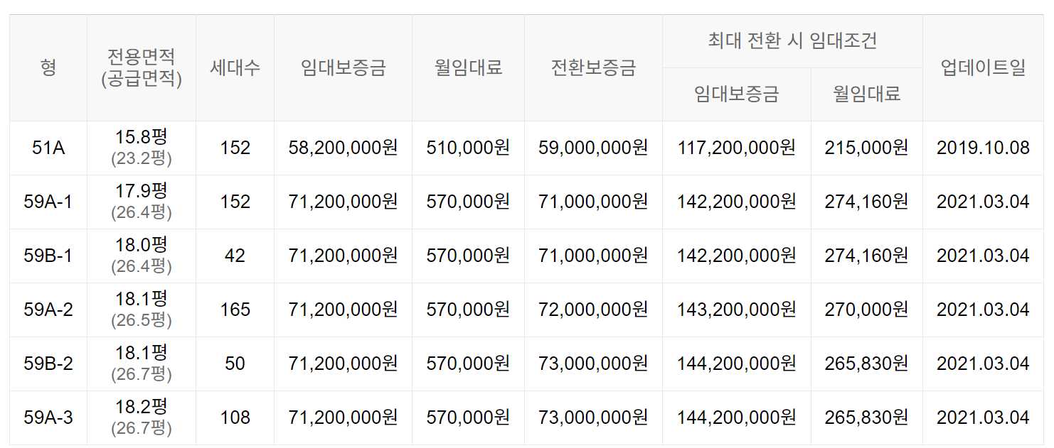 임대보증금 및 월 임대료는 입주자 모집공고일 기준이며, 보증금 최대 전환 시 변동될 수 있습니다.