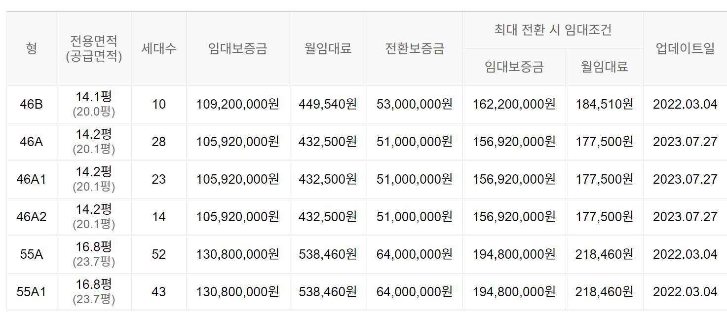 임대보증금 및 월 임대료는 입주자 모집공고일 기준이며, 보증금 최대 전환 시 변동될 수 있습니다.